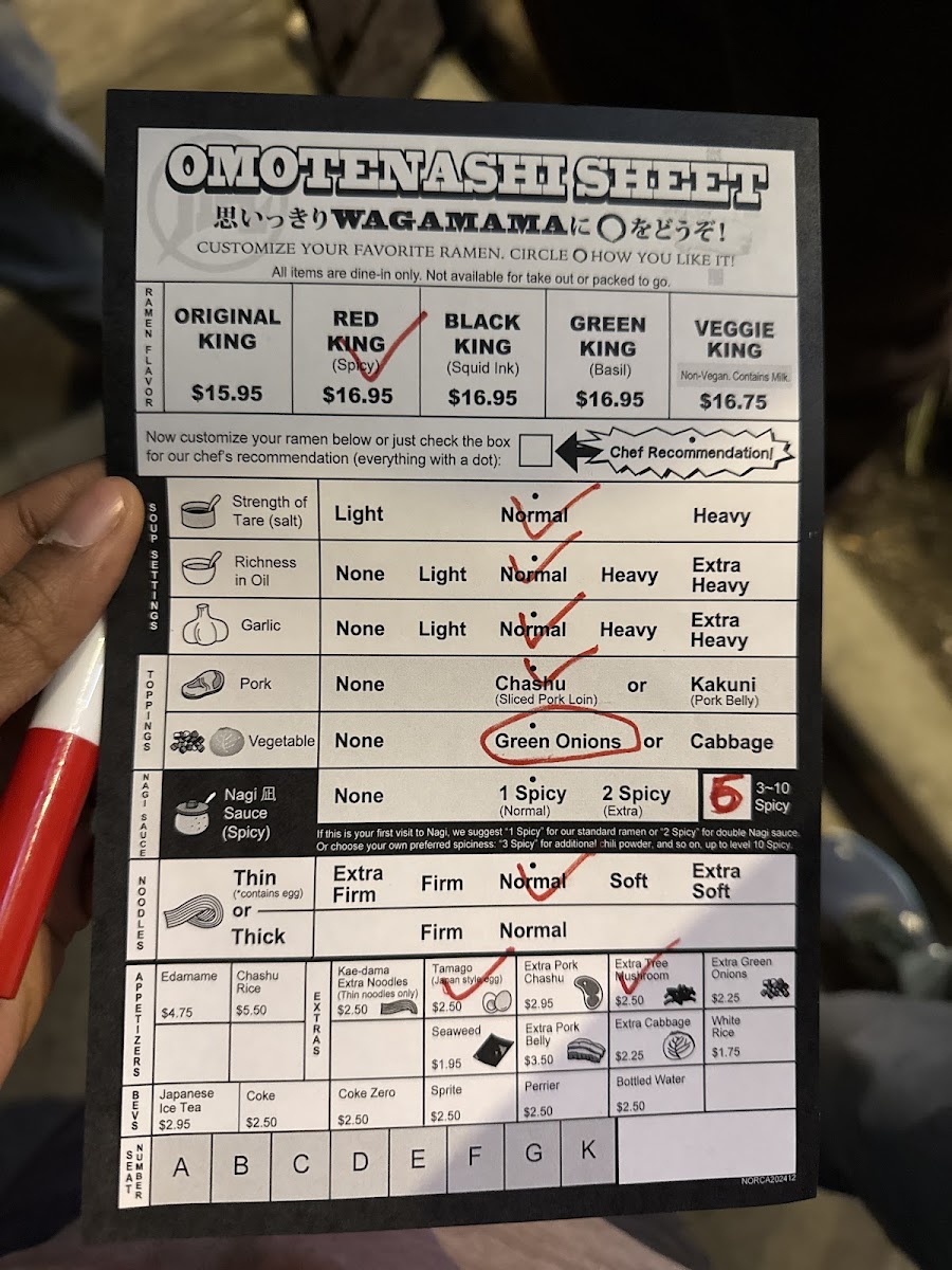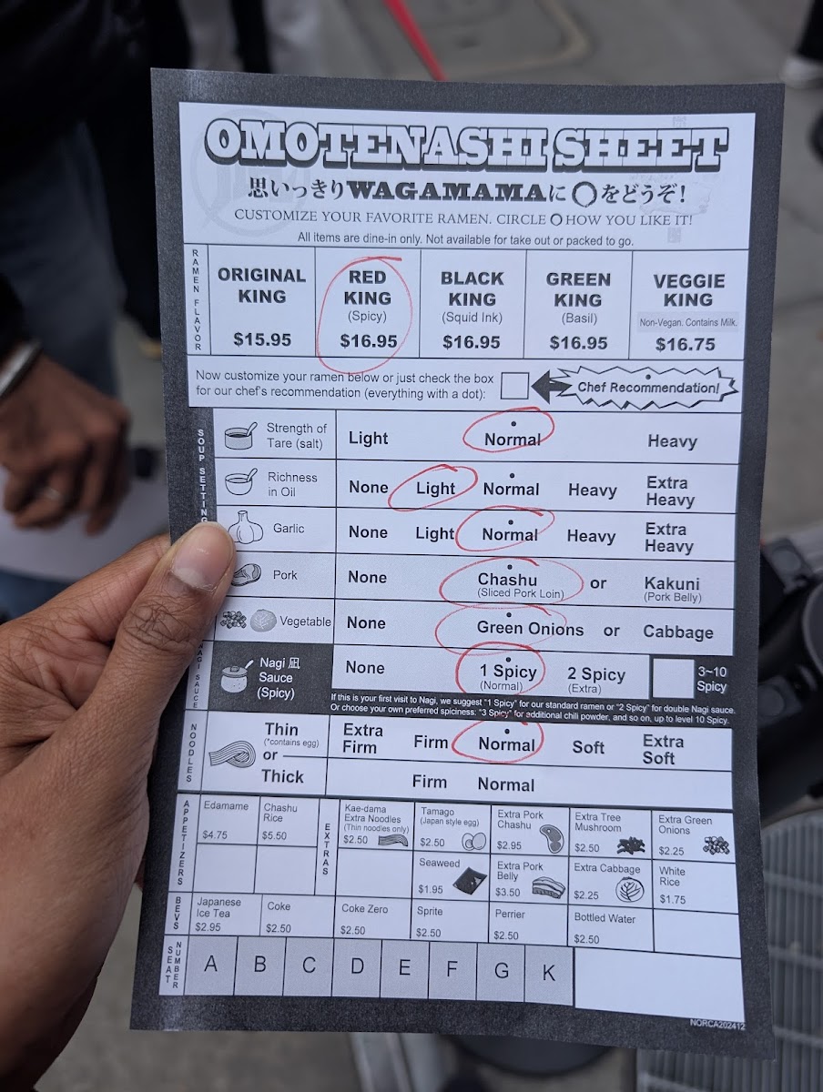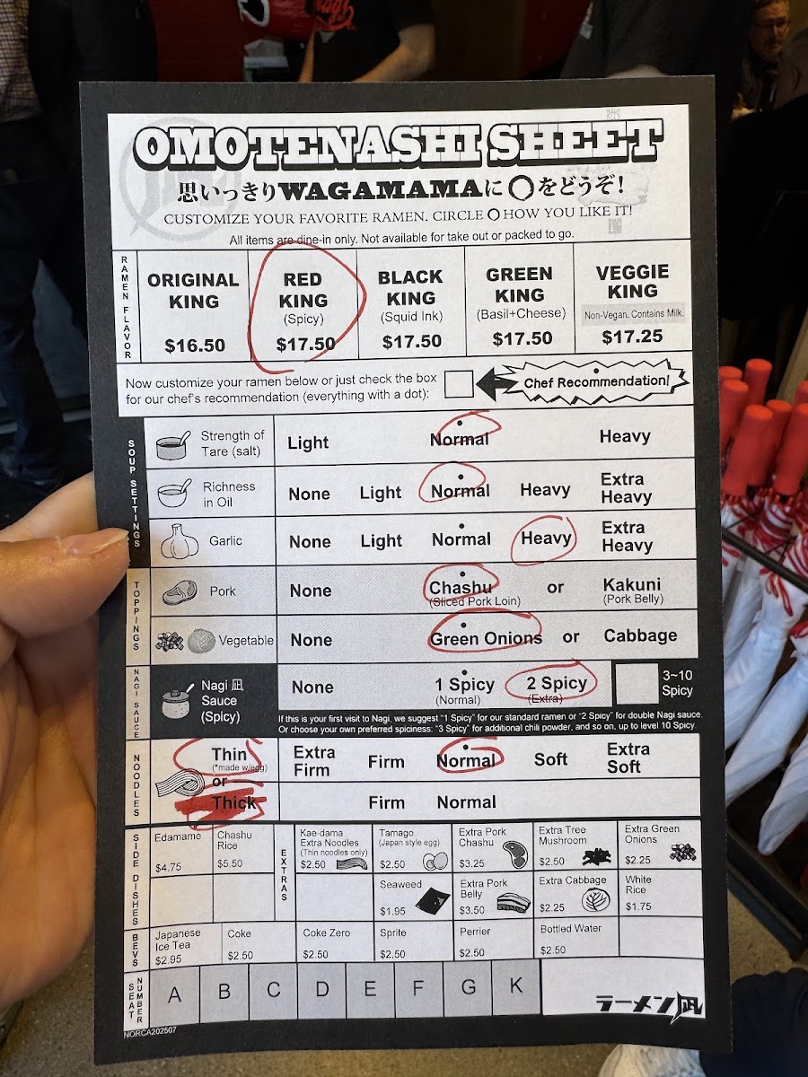 Walking into Ramen Nagi, you’ll notice the lively buzz and cheerful chatter of fellow food lovers while the rhythmic sounds of the kitchen enhance the ambiance. The restaurant’s design offers a warm and inviting space, but it’s important to note that during peak hours, you might find yourself in line—though past patrons affirm that the wait is worth it. Customers like Bhushan Patel and J H laud the depth of the ramen’s flavor, indicating that whether it’s your first visit or you’re a returning regular, the richness of the broth and the crafted experience keeps you coming back. However, be mindful of the spice level; it can be intense, and choosing your desired heat is part of the fun!